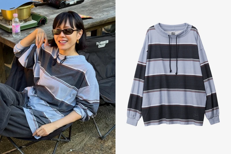 孙艺珍在这套露营穿搭中,穿着Oversized的条纹抽绳上衣,搭配绒面休闲长裤,而这件条纹上衣则是来自韩国古着选品店ÉCRU推出的系列单品之一,在主打男女皆可穿的Unisex风格与复古美学的设计感之下,这件条纹上衣有着洗旧的质感,搭配上宽窄搭配的条纹色块设计,颇有复古的美式休闲氛围,在孙艺珍穿上后,品牌官网的同色系款式也光速售罄。